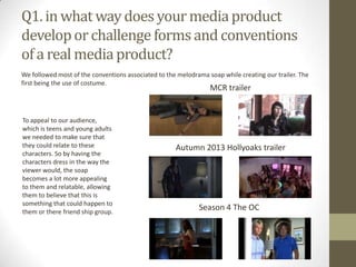 Liam Denton evaluated his media production project of creating a trailer for a soap opera called MCR. He followed many conventions of the melodrama soap genre including using costumes the target audience could relate to, using idents to foreshadow events, and incorporating non-diegetic music. He also challenged some conventions by establishing a strong regional identity set in Manchester. Liam analyzed how effective the combination of his main trailer text and ancillary materials like a billboard poster and website were at reinforcing the MCR brand. He learned from audience feedback that his editing was good but some clips needed trimming to increase pace. Liam utilized various technologies in his research, planning, production and evaluation including DSLR cameras, i