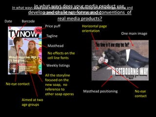 The document discusses the various forms and conventions used in a media product including a date, barcode, price, page orientation, images, taglines, mastheads, fonts, weekly listings, storyline focusing on one soap opera without references to others, masthead positioning, targeting two age groups, including the Channel 4 logo, using stock characters, evaluating the effectiveness of combining main and ancillary texts, using technologies like Photoshop CS4, Final Cut Pro, Soundtrack Pro in construction and research, and learning from audience feedback mechanisms like peer evaluation and questionnaires.
