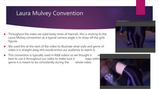 This document discusses how the media product adheres to or challenges conventions of real R&B music videos and related media. It notes that body shots of the artist were used to illustrate genre and entice the audience, in line with Laura Mulvey's convention. Close-ups were incorporated to create a relationship with the audience and sense of voyeurism. The digipak and magazine ad feature the main artist image and consistent branding to make the artist recognizable. Lyrics and visuals, as well as music and editing, are linked to portray the song's message and artist's emotions through conventions typical of music videos.