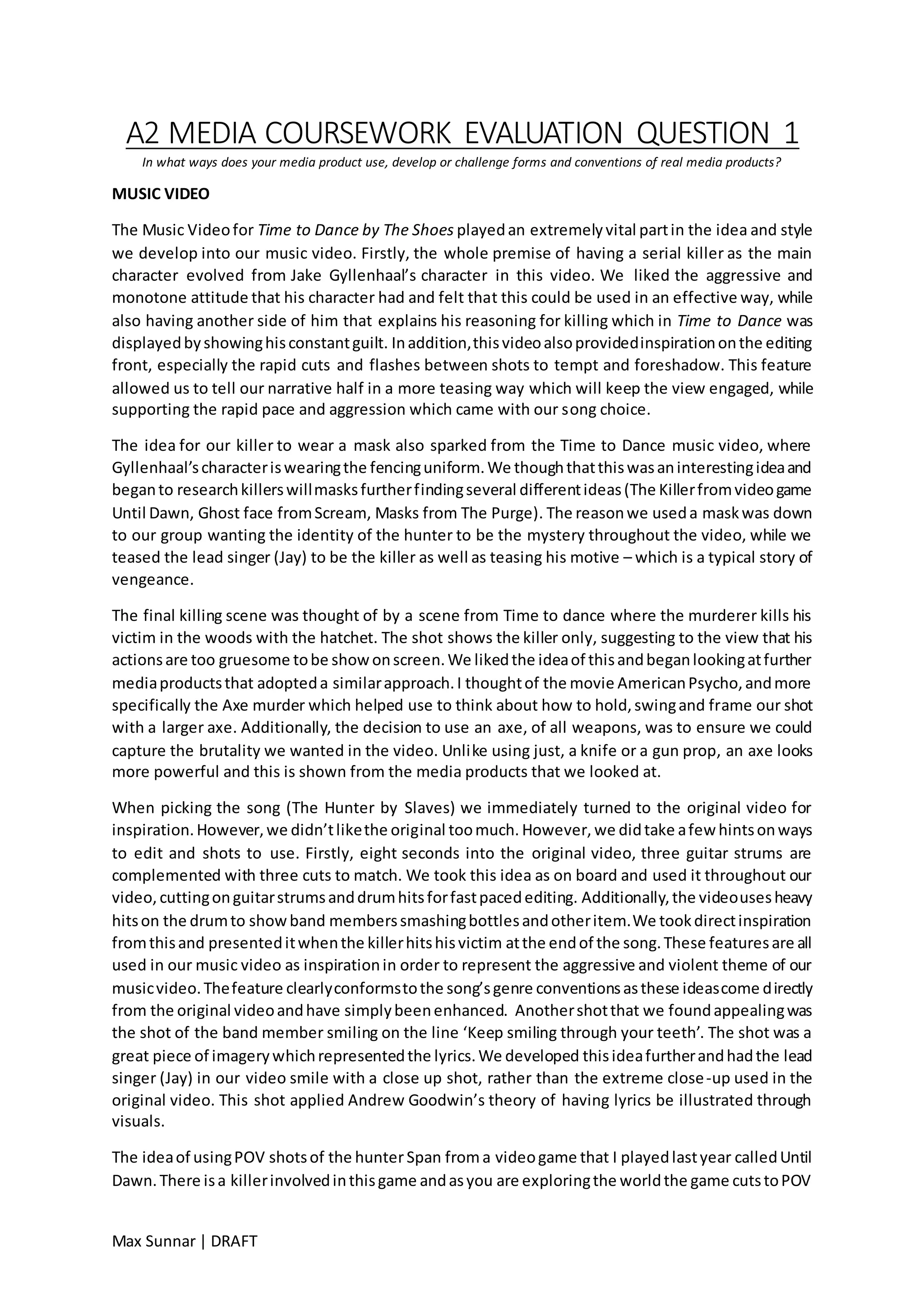 The document provides an evaluation of the ways in which the student's music video product uses, develops, or challenges conventions of real music videos. It summarizes numerous influences and references for the video's concept, style, shots, and editing from other music videos and media products. Key influences included the music videos for "Time to Dance" by Jake Gyllenhaal, "The Hunter" by Slaves, "Control" by Chase and Status, and elements from films like American Psycho. The design of the accompanying digipak and magazine ad were also influenced by album artwork, using themes of mazes and a color scheme inspired by films like American Psycho and Se7en.