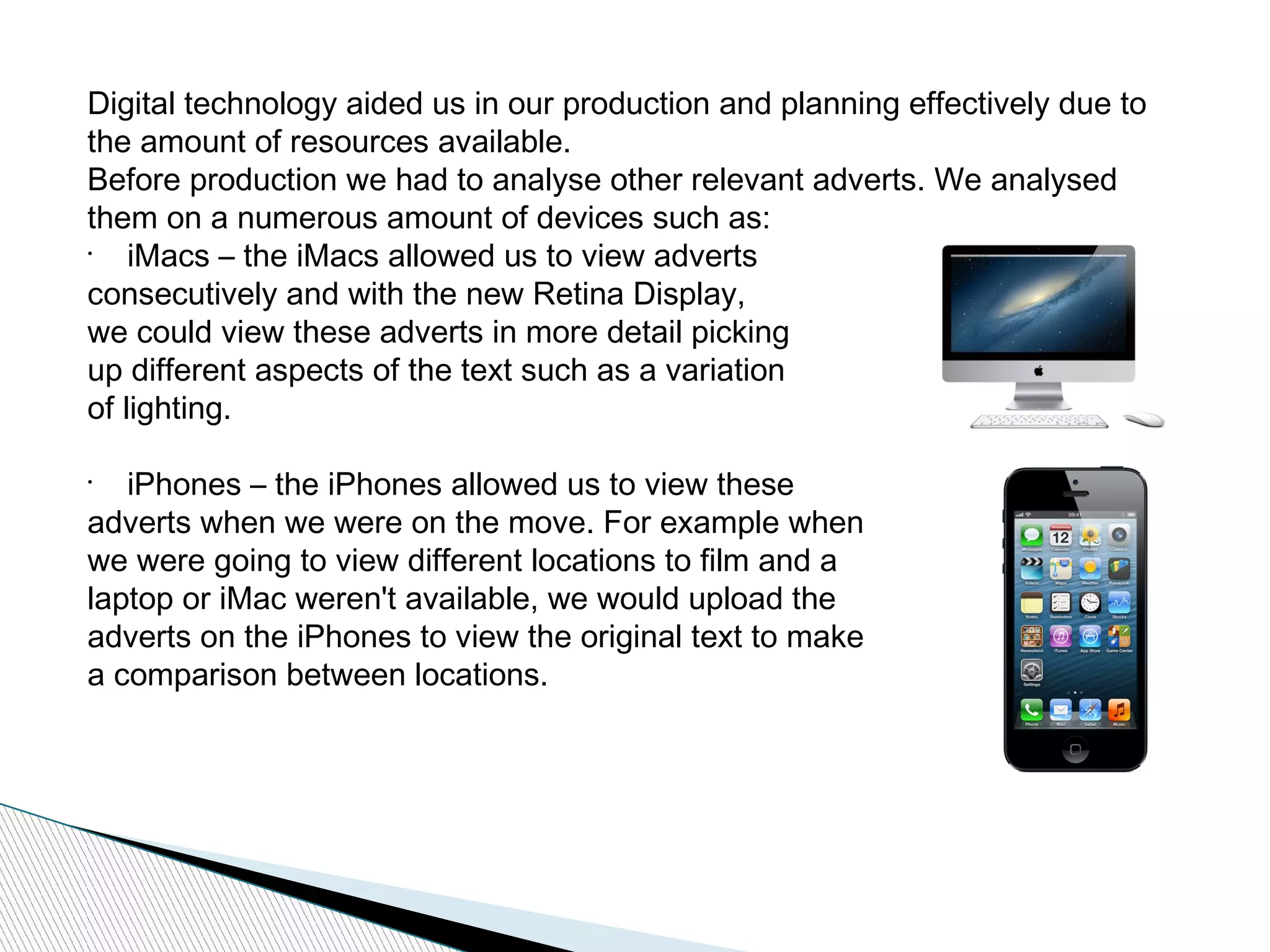 This document discusses the use of digital technology in planning, producing, and editing a media project. During planning, the team analyzed other advertisements using iMacs, iPhones, a digital projector, and YouTube to view details and stream trailers. An iPhone and Sony digital video camera were used for production due to their compact size and high video quality. Photoshop and iMovie were used in post-production; Photoshop to create graphics and iMovie to edit sound, cut scenes precisely, and add transitions between shots like dissolves and fades. Digital tools provided accessibility and allowed for iterative improvements during each stage of the project.