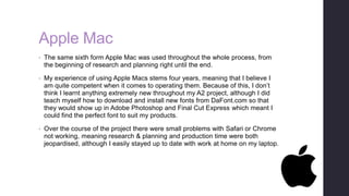 The student used various media technologies throughout the project from research and planning to production and evaluation. Apple Mac, Blogger, Google, YouTube, Prezi, Slideshare, Animoto, a DSLR camera, video camera, tripod, Adobe Photoshop, and Final Cut Express were used at different stages. The student became more proficient in some technologies like Prezi from prior experience but also learned new skills like creating textured text effects in Photoshop. Web 2.0 principles of participatory culture applied as the student took an active role in creating media instead of just consuming it.