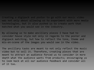 The student created a poster and digipack to accompany their music video, matching the style and tone of the video. This required considering elements like color palette, imagery, and fonts to effectively promote the video across different media. Testing ideas like incorporating all actresses or bold colors, the student ultimately chose a striking black-and-white image and repeated font to maintain cohesion across pieces while intriguing audiences. Feedback affirmed this approach, and the combination of ancillary texts and video allowed the student to apply various skills and demonstrate their understanding of the industry in creating a cohesive promotional package.