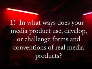 The document discusses conventions of movie posters and trailers. It provides guidance on constructing an effective horror film trailer, including using fast cuts to build tension, low camera angles to make the audience feel vulnerable, and close-ups to build empathy for the main character. Color schemes, imagery, and unsettling sounds and music should be used to set an ominous tone. While revealing some hints about the plot, an effective trailer will also raise questions to intrigue the audience. Feedback on a draft trailer suggests making edits to better follow trailer conventions and more clearly portray the plot and psychological thriller genre.