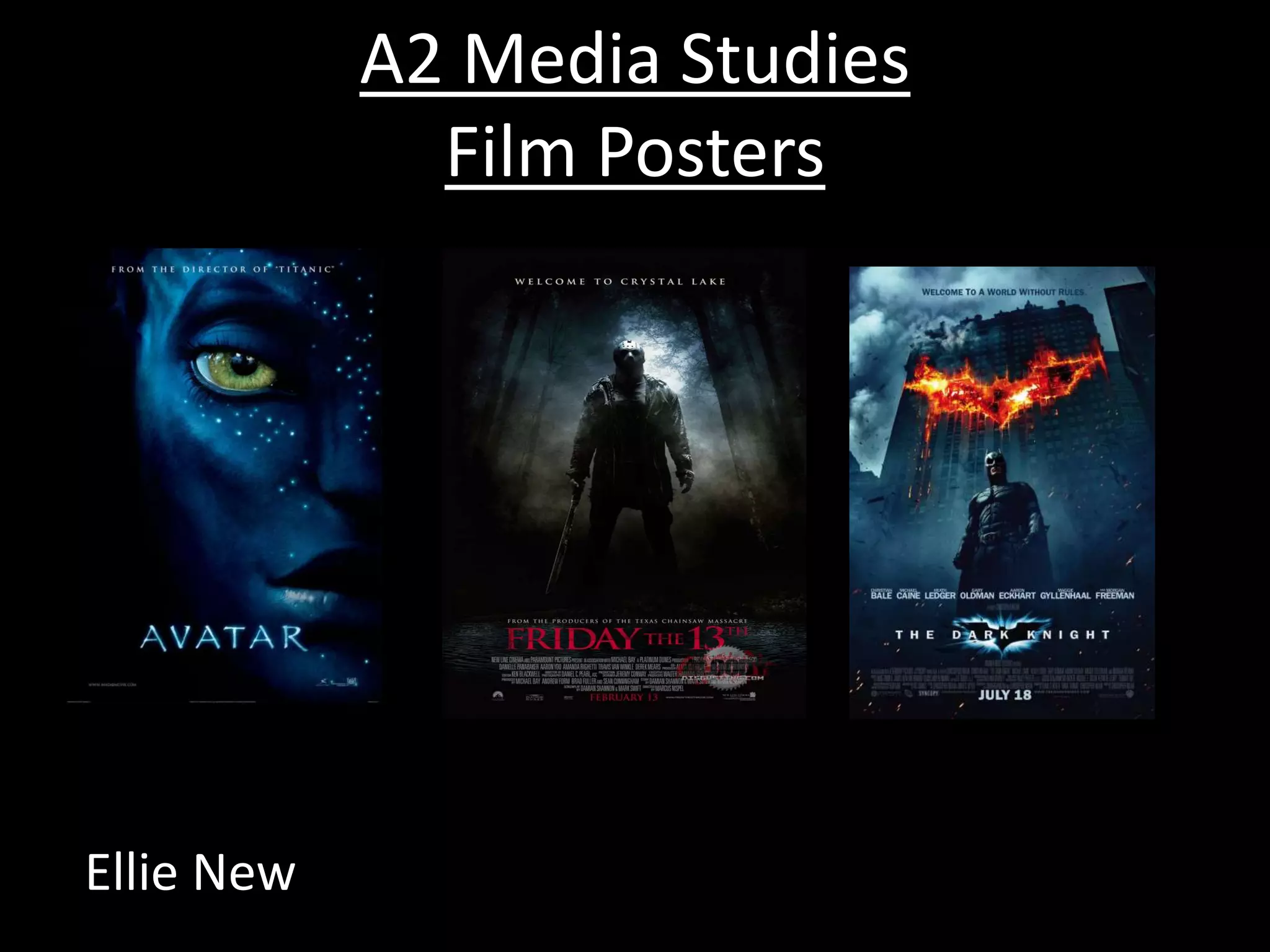 This document analyzes several film posters, noting various design elements and how they are intended to attract audiences. For the Batman poster, it highlights the contrasting colors that make the symbol stand out, the tagline that draws people in, and the protagonist's powerful pose. For Avatar, it discusses the direct address from the character, the mystery of only showing half their face, and references to other films. For Friday the 13th, it points out the killer's dominant image that may scare audiences, references to another film in the genre, and how the title and release date stand out in red.