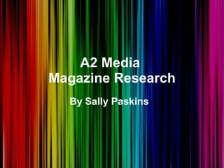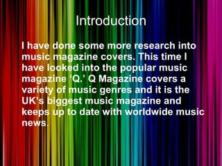 Sally Paskins has researched magazine covers of Q Magazine and Mojo Magazine. She analyzed their covers and found that Q Magazine appeals to an older audience, shown through its plain color schemes and mature photographs. Mojo Magazine also targets an older demographic, using dark colors and sometimes black and white on covers. However, some special editions of both magazines featured brighter colors and different designs. Sally plans to create a special edition magazine cover promoting an 80s-style artist, so she will use bright colors inspired by those special editions to tie her products together and appeal to her target audience.