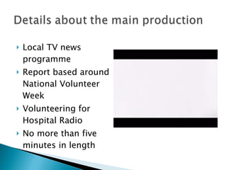 The document outlines a local news package about volunteering at a hospital radio station for National Volunteer Week. It will be no more than five minutes and include two examples of similar packages from other news programs. The intended audience is those aged 16 and older as under 16s cannot volunteer at the station. The package will include interviews with volunteers, footage from inside the studio, and information on how to get involved. It will also have accompanying audio and web page tasks.