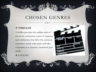 Thriller is a genre that uses suspense and excitement to drive the narrative. It has several conventions including exotic locations, a fast pace, heroes/villains, false endings, and leaving things to the imagination. There are several sub-genres of thriller like psychological thriller, spy thriller, political thriller, horror thriller, and supernatural thriller. The primary elements of a thriller include the protagonist facing death, an initially stronger antagonist, the protagonist on a quest that can't be stopped, a mystery that must be solved from the protagonist's point of view, and credible realistic representations of action and characters.