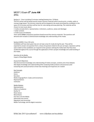 The document outlines an assessment structure for a media studies course, detailing exam sections, key concepts, and theoretical frameworks such as audience theory, media representation, and narrative analysis. It emphasizes the necessity for students to navigate various media formats, deconstruct texts, and apply critical media theories. Additionally, it discusses the impact of digital media, audience interaction, and the evolving nature of media institutions and their representations.