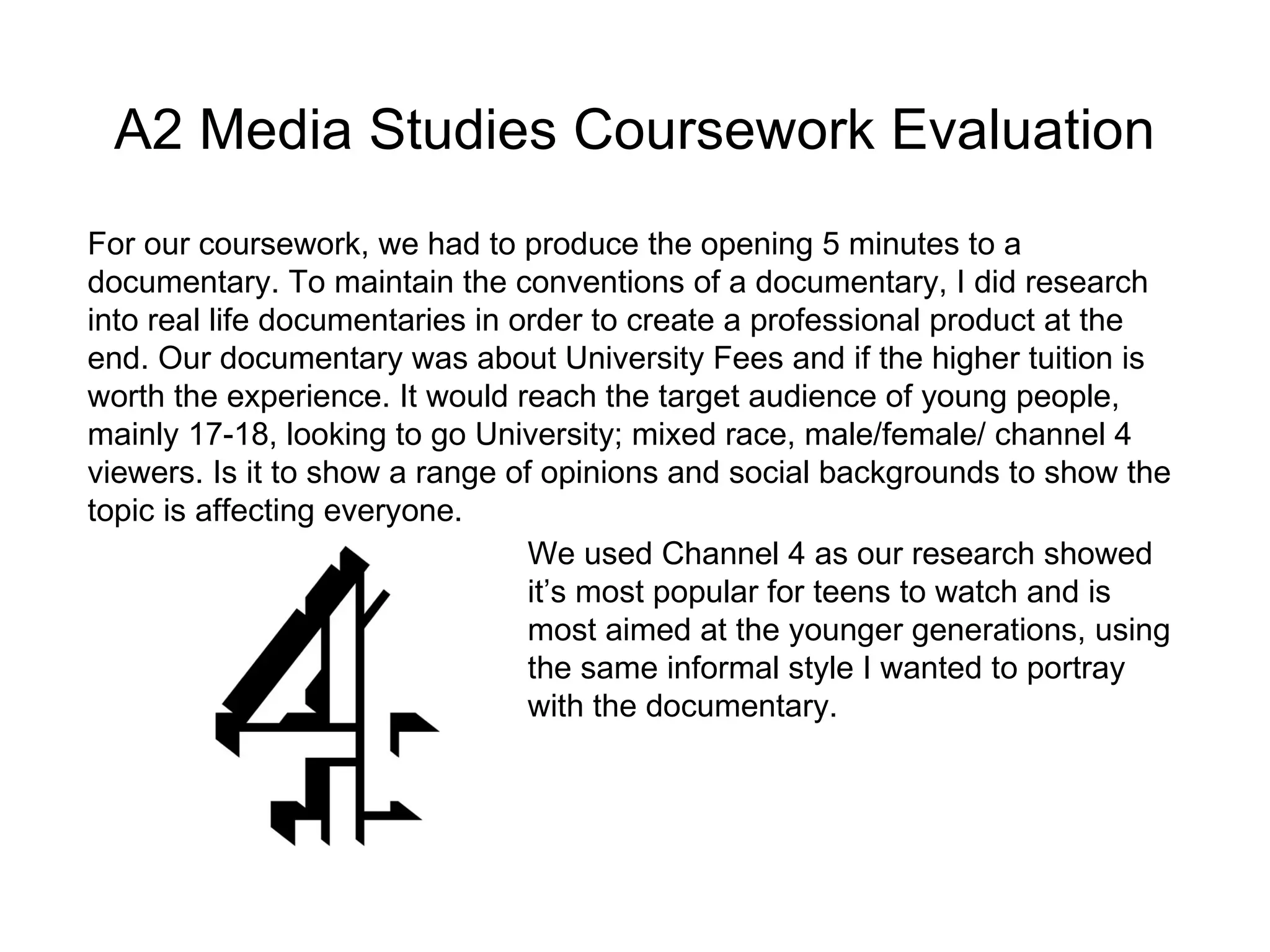 The document summarizes an evaluation of a student's A2 media studies coursework where they produced the opening 5 minutes of a documentary about university fees. It discusses how the documentary and supplementary materials like a listings page and radio trailer utilized or challenged conventions of real media to engage their target audience of 17-18 year olds considering university. Codes and conventions from channel 4 documentaries like interviews, shots, transitions, sound, and listings pages were employed, while some elements like transitions and images on the listings page were challenged.