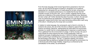 The document analyzes and summarizes the key visual elements and implied meanings across three images from the album packaging of Eminem's "Curtain Call". The front cover depicts Eminem bowing, surrounded by roses, implying he is being applauded for a successful performance. The inside cover shows artists in a studio, with one looking frustrated, suggesting the effort that went into making the album. The back cover again features Eminem among roses and track titles, indicating the songs led to his success and form his legacy, while extensive shadowing implies they are from past albums.