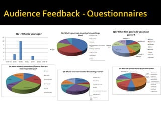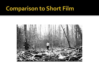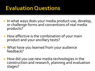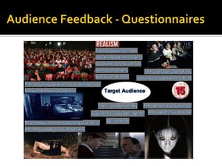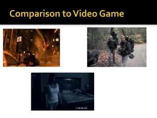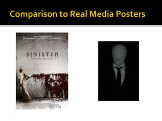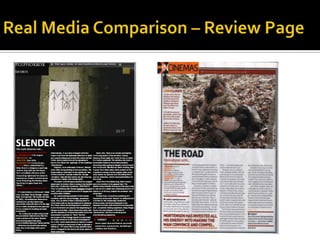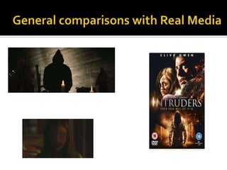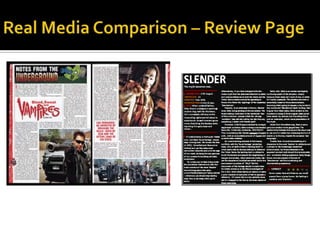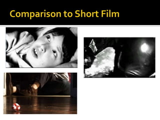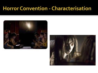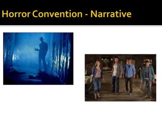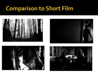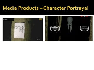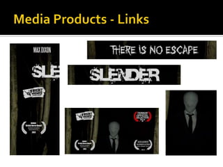 This document discusses how the media producer's short horror film used and developed conventions of the horror genre from other real media products. It provides details on how the film followed typical conventions for setting, technical codes, iconography, narrative, characterization, and themes for the horror genre. It also discusses how the film was inspired by the video game Slender Man and the short film The Nightmare in its approach. The document analyzes specific elements that both followed and challenged conventions from these inspirational works.