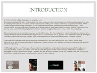 The document provides a reflection by the student on three media products they created: a short film, website, and postcard. The student discusses how they incorporated conventions and addressed social issues in their work. They aimed to represent an average family and teen girl. Elements like similar imagery, colors, fonts, and an original production company name were used across products to create branding. Feedback from test audiences was positive overall praising elements like camerawork, characters, and the issue of cyberbullying addressed. The student considers distribution methods for the short film like YouTube, festivals, or giving to schools.