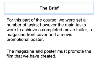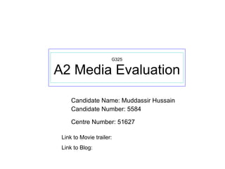 The document outlines Muddassir Hussain's media evaluation for a film project, detailing the creation of a movie trailer, magazine cover, and promotional poster focused on horror conventions. It explains how research informed the design choices, such as color schemes and layout, to effectively target a specific demographic, emphasizing aspects like imagery and text that resonate with horror genres. Additionally, it discusses the production process, audience feedback, and the use of various new media technologies in creating and promoting the film.