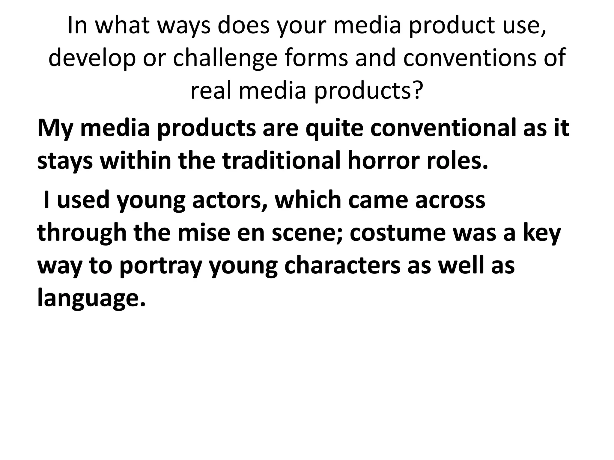 - The film uses conventions like young actors in casual clothing to portray characters and informal language to imply youth. This stays within traditional horror tropes.