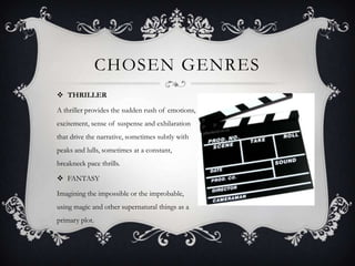 This document analyzes the thriller and fantasy genres. It outlines several key conventions and characteristics of each genre, including exotic locations, fast pacing, heroes/villains, and false endings for thrillers. It also discusses sub-genres like psychological, spy, and supernatural thrillers. For fantasy, it mentions elements like magic, mythical beings, and medieval settings. The document explains that these genres were chosen for the film project because the story of Hansel and Gretel incorporates both fantasy and thriller elements, such as the characters running away in fear to create suspense.