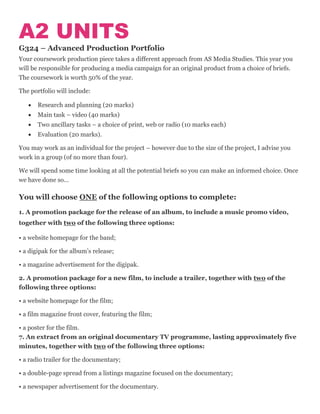 This document provides information and guidance for a Year 13 A2 Media Studies course. It outlines the two units - the Advanced Production Portfolio coursework project worth 50% and the Critical Perspectives exam worth 50%. For the coursework, students must complete a media campaign on an original product. Deadlines for drafts and final submissions are provided. Recommended wider reading materials include books on media theory and a list of influential films. University options for Media Studies are listed, and advice is given on preparing applications, such as compiling a show reel of work.