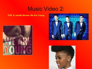 The document summarizes and analyzes the music video for "We Are Young" by Fun. and Janelle Monae. It notes that the band is presented in older fashioned attire in a modern club setting. While there is some relationship between the images and lyrics around a teenage girl experiencing the party scene, the author feels they do not coincide strongly enough. Common features of the video include the band's suits, a teenage girl dancing and getting into trouble, and slow motion effects. The main tagline and catchphrase referenced is the song's title "We Are Young."