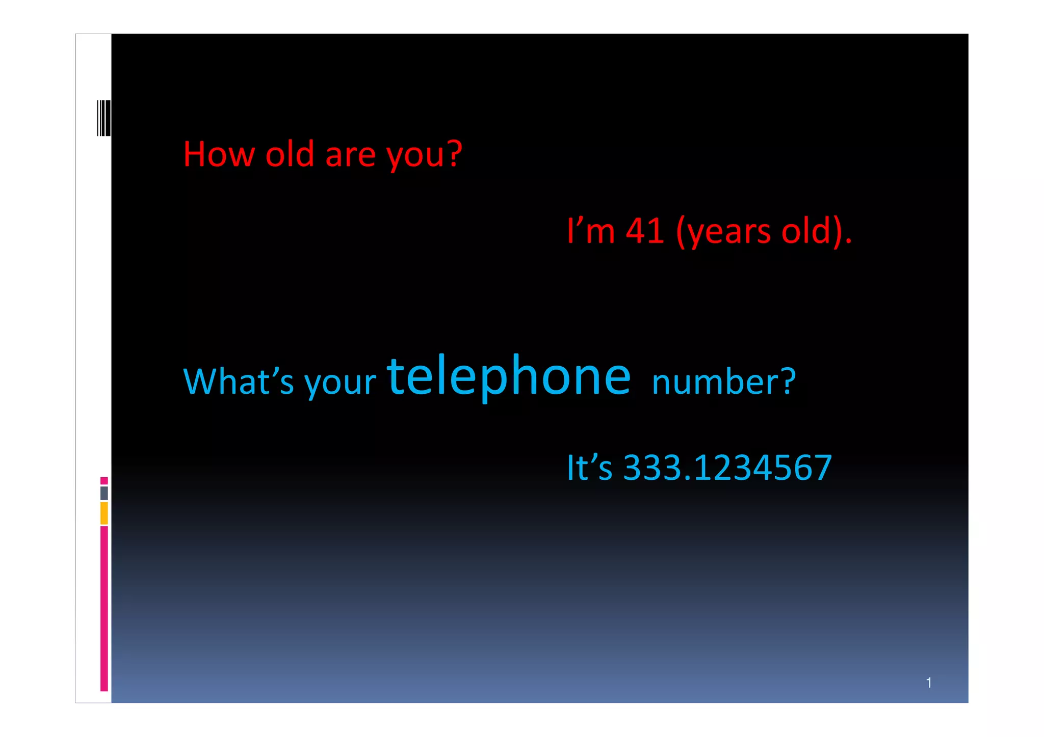 The document contains a short dialogue where a person asks about someone's age and phone number. They respond that they are 41 years old and their phone number is 333.1234567.