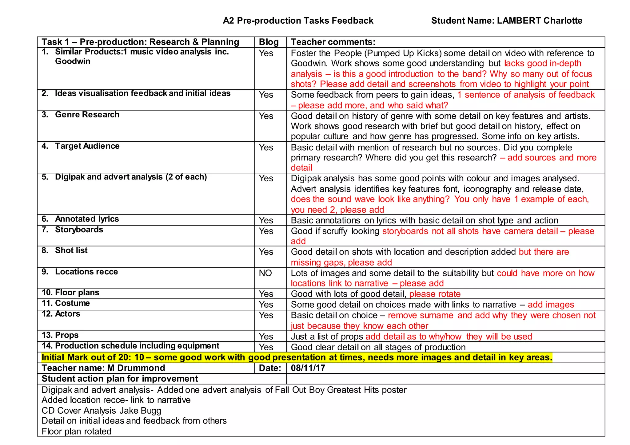 This document provides feedback from a teacher to a student on their pre-production work for a music video project. The teacher comments that some areas of the student's work showed good research and planning, but many parts lacked sufficient detail, analysis or examples. The teacher provides specific feedback on each of the 14 pre-production tasks, noting what was done well and improvements needed. Areas identified as needing more work included deeper analysis, additional details, sources, images and linking locations to the narrative. The student is given an initial mark of 10 out of 20 and asked to improve their work in key areas identified by the teacher.