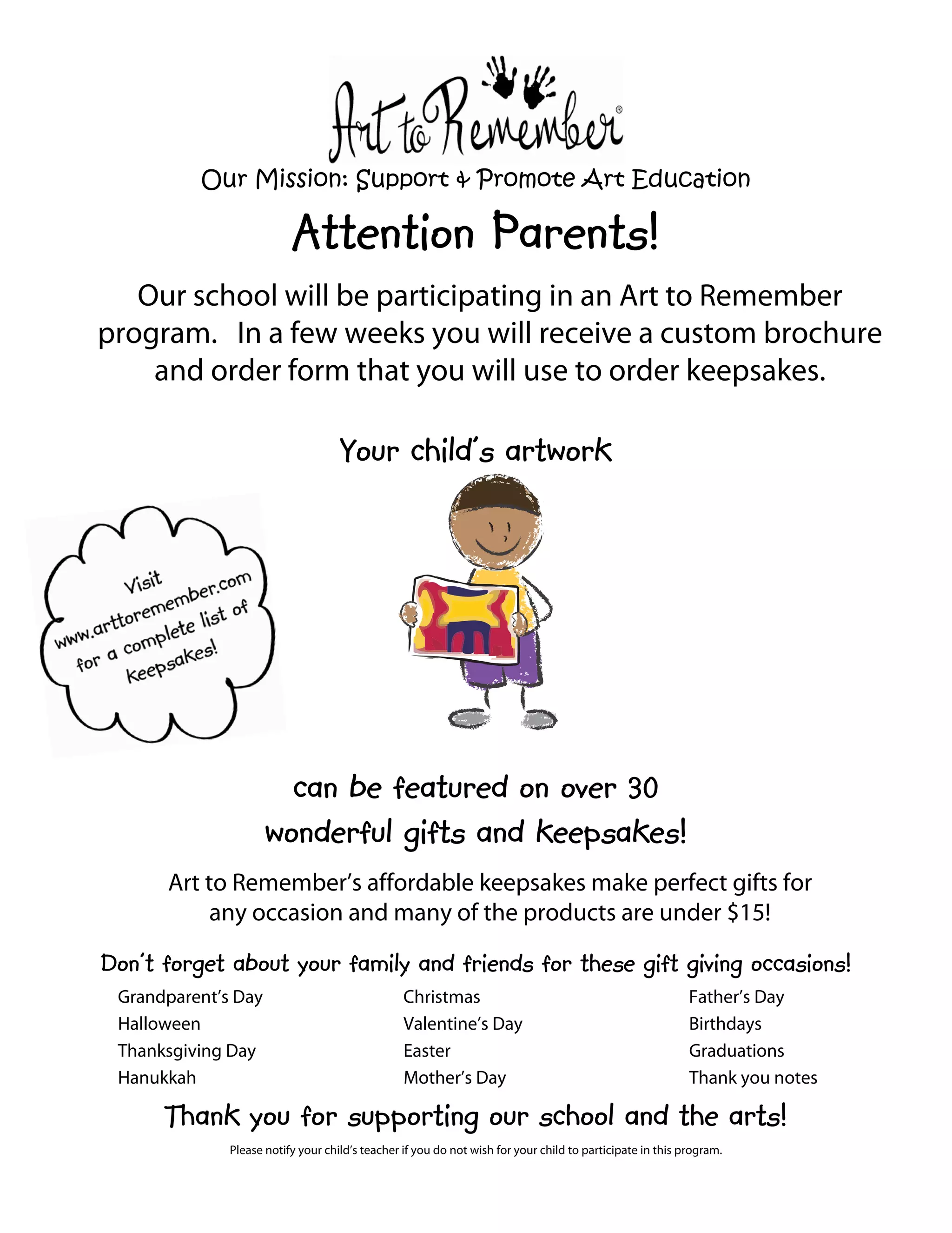 The school will be participating in an Art to Remember program where students' artwork will be featured on gifts and keepsakes that parents can order, such as mugs, cards, calendars, and photo books. Parents will receive an order form and brochure in the coming weeks to purchase affordable artwork-inspired gifts for family and friends for various occasions throughout the year. The program supports art education at the school.