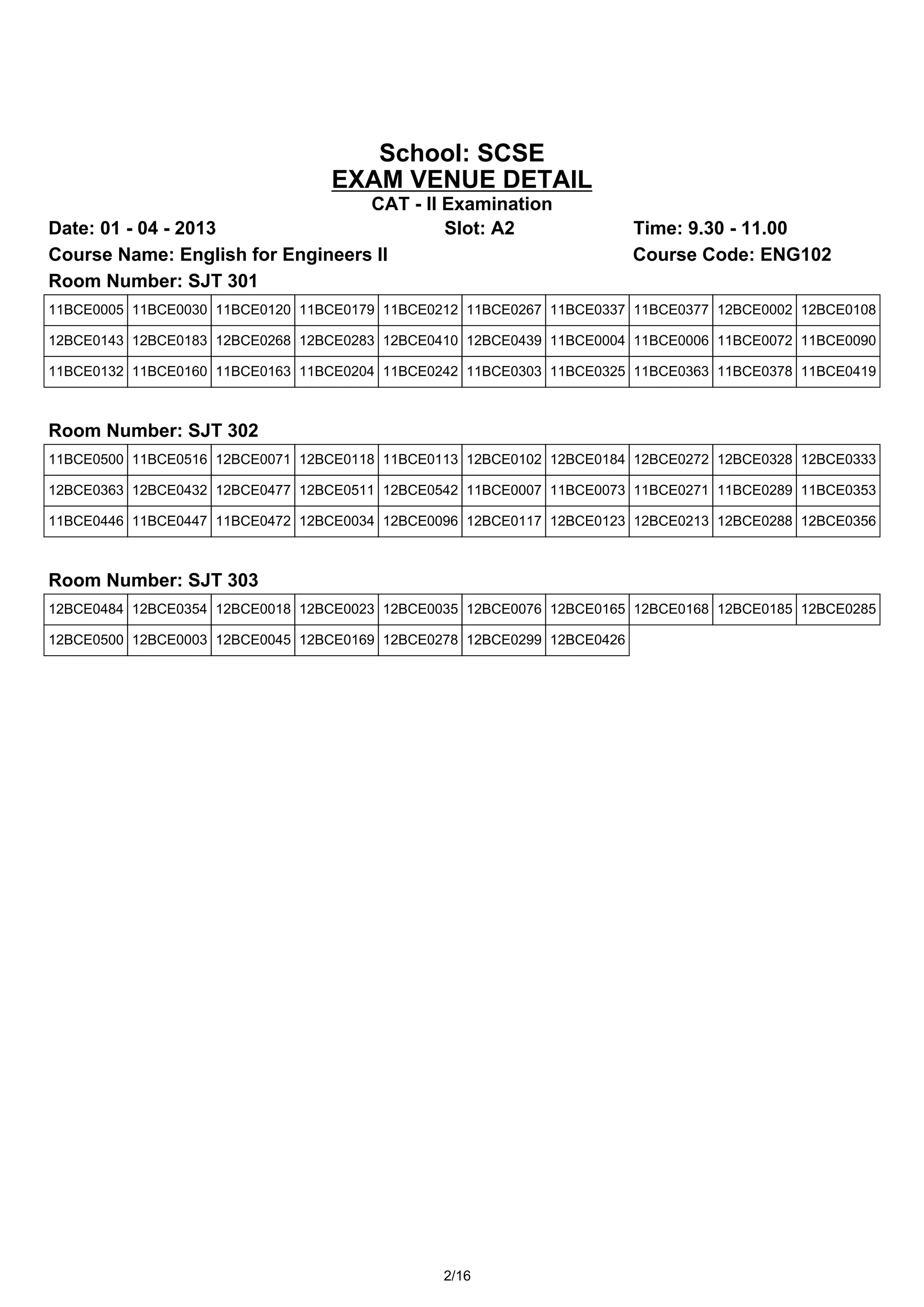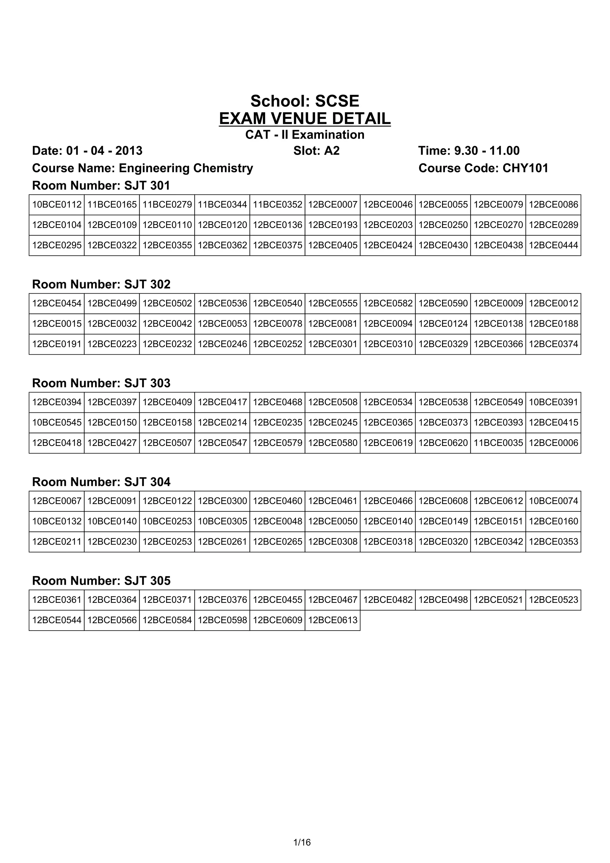 This document provides exam venue details for various courses being held on April 1, 2013 from 9:30-11:00 AM (Slot A2). It lists the course name, code, and room numbers along with student roll numbers assigned to each room for six different exams.