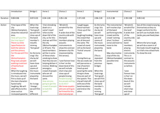- Shots include close-ups, inserts, timelapses, and scenes featuring a band performing and a crowd.