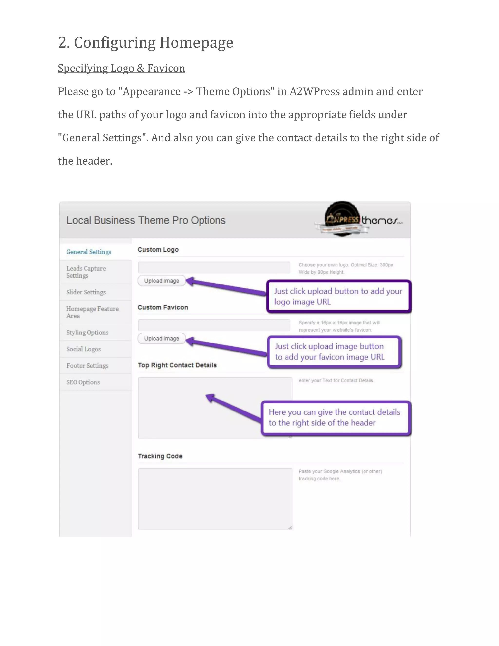 The document provides comprehensive guidelines for customizing a2wpress local business websites, covering steps to create pages, configure settings, and add features such as sliders, galleries, and contact forms. It details the options available for styling, menus, and widgets, ensuring users can tailor their websites effectively. Additionally, resources for video demos and professional assistance are mentioned for further support.