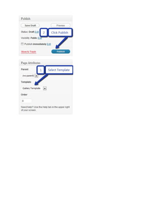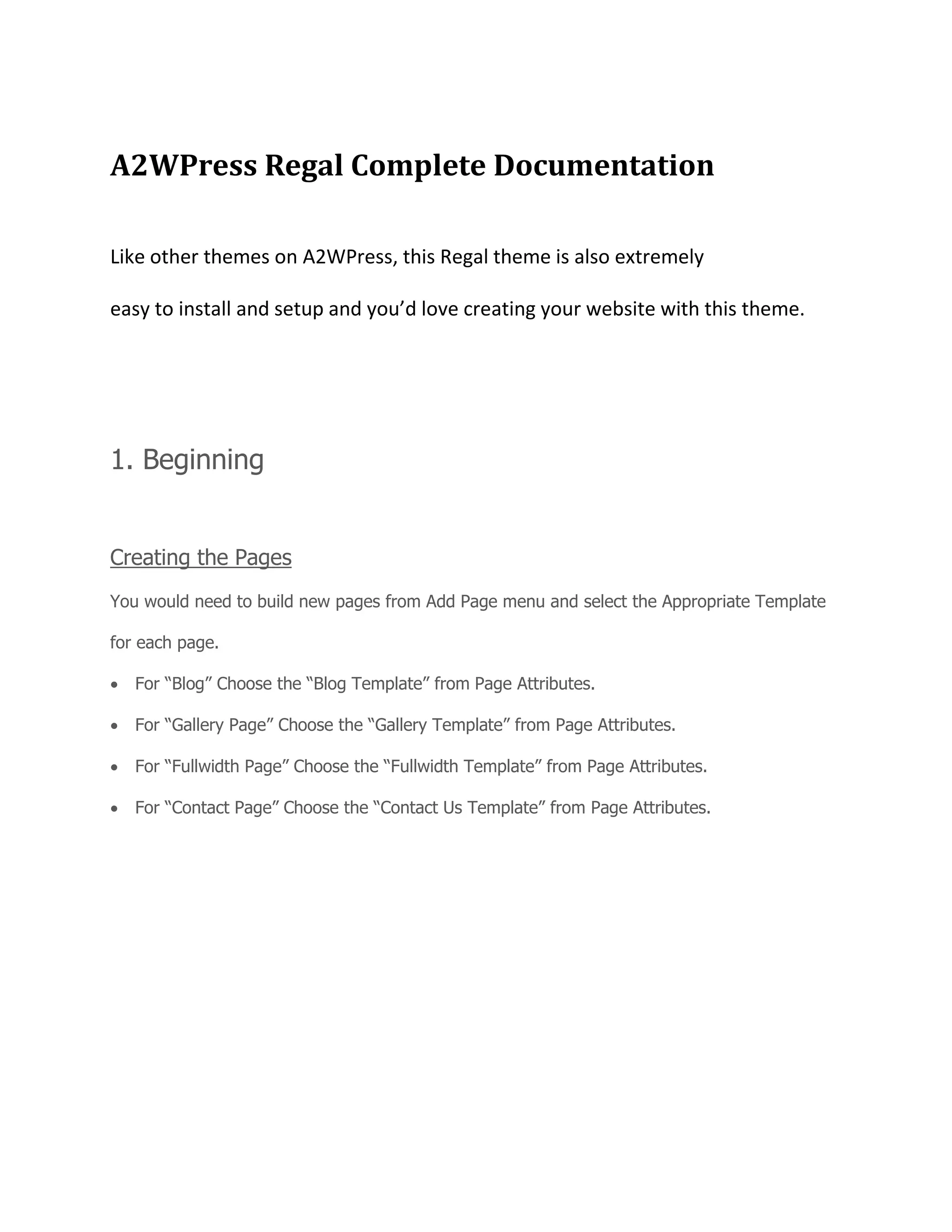 The document provides comprehensive instructions for installing and setting up the Regal theme on a2wpress, including detailed steps for creating different page types like blogs, galleries, and contact pages. It covers homepage customization, social media integration, styling options, and menu management. Additionally, it offers guidance on using widgets and includes suggestions for further assistance through video demos or professional help.