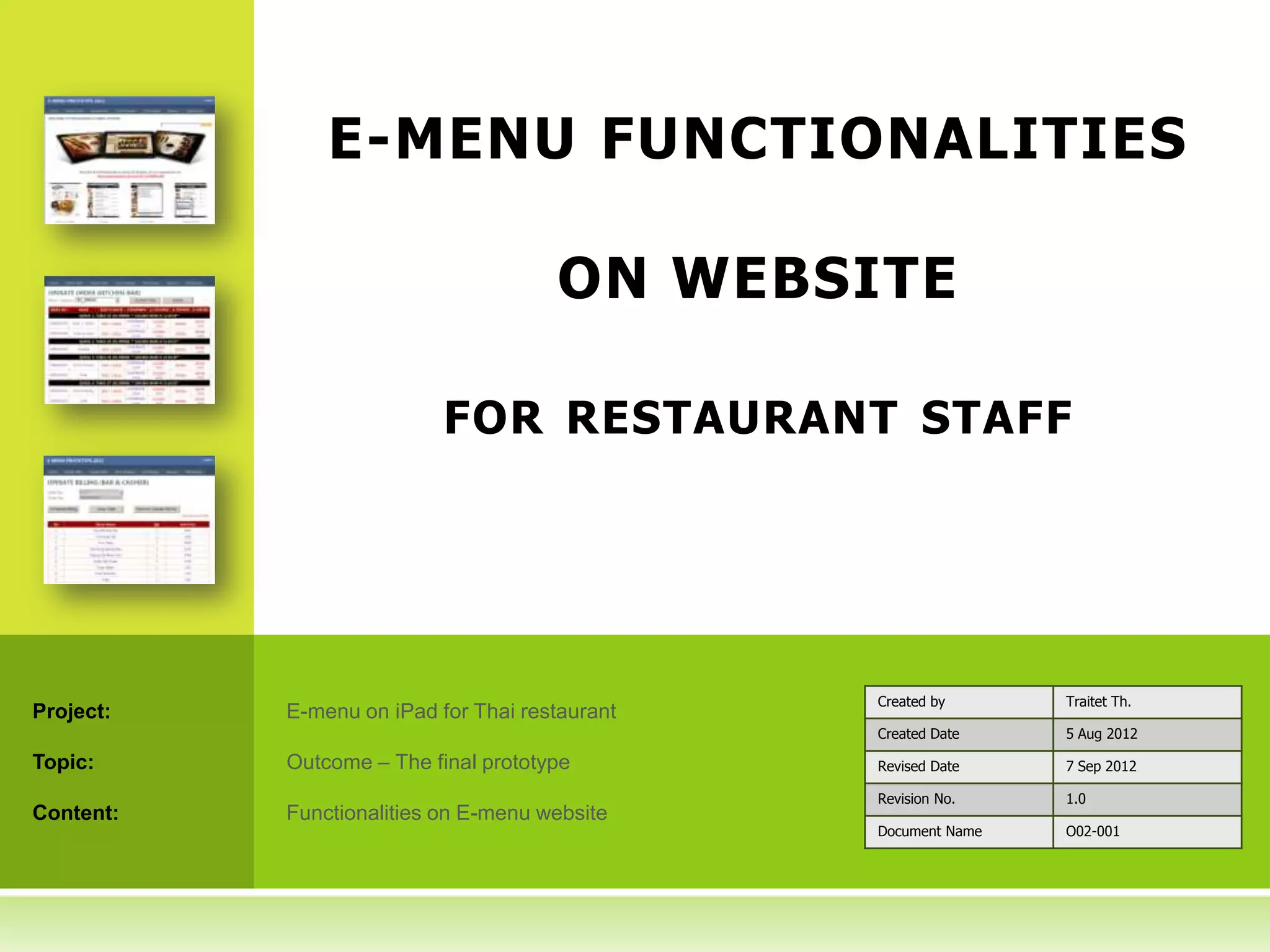 The document provides an overview of the functionalities of an e-menu website for restaurant staff. It includes: