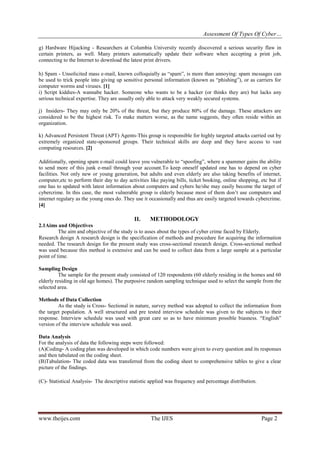 The document discusses a study that assessed the types of cybercrimes faced by elderly individuals residing in their own homes or old age homes. The study found that the majority of respondents reported not being affected by cyber pornography, phishing, money laundering, password sniffing, credit card fraud, or web jacking regardless of where they resided. Hacking was the most commonly reported cybercrime, with 60% of elderly living at home reporting being affected, compared to 41.7% of those living in old age homes. The document provides background on common types of cybercrimes such as hacking, cyber stalking, and spamming.