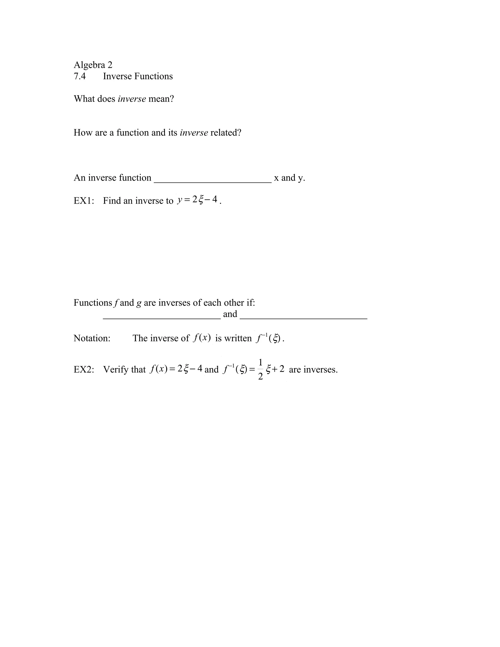 This document discusses inverse functions. It explains that an inverse function switches the x and y values of the original function. It provides examples of finding the inverse of functions like y=2x-4 and verifying two functions are inverses. It also discusses graphing the inverses of quadratic and cubic functions and whether they pass the horizontal line test to be considered a function. The document ends with assigning homework problems related to inverse functions.
