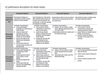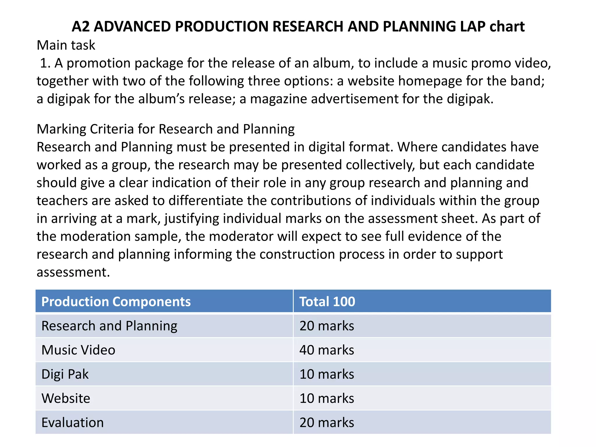 This document outlines the requirements and marking criteria for an A2 Advanced Production research and planning task. Students must create a promotion package for a music album, including a music video and two other promotional elements. Research and planning must be presented digitally and indicate individual contributions. The task will be marked out of 20 and evaluated based on the thoroughness of research, audience analysis, pre-production planning, and digital presentation. Progress will be tracked using a learning and progress chart.