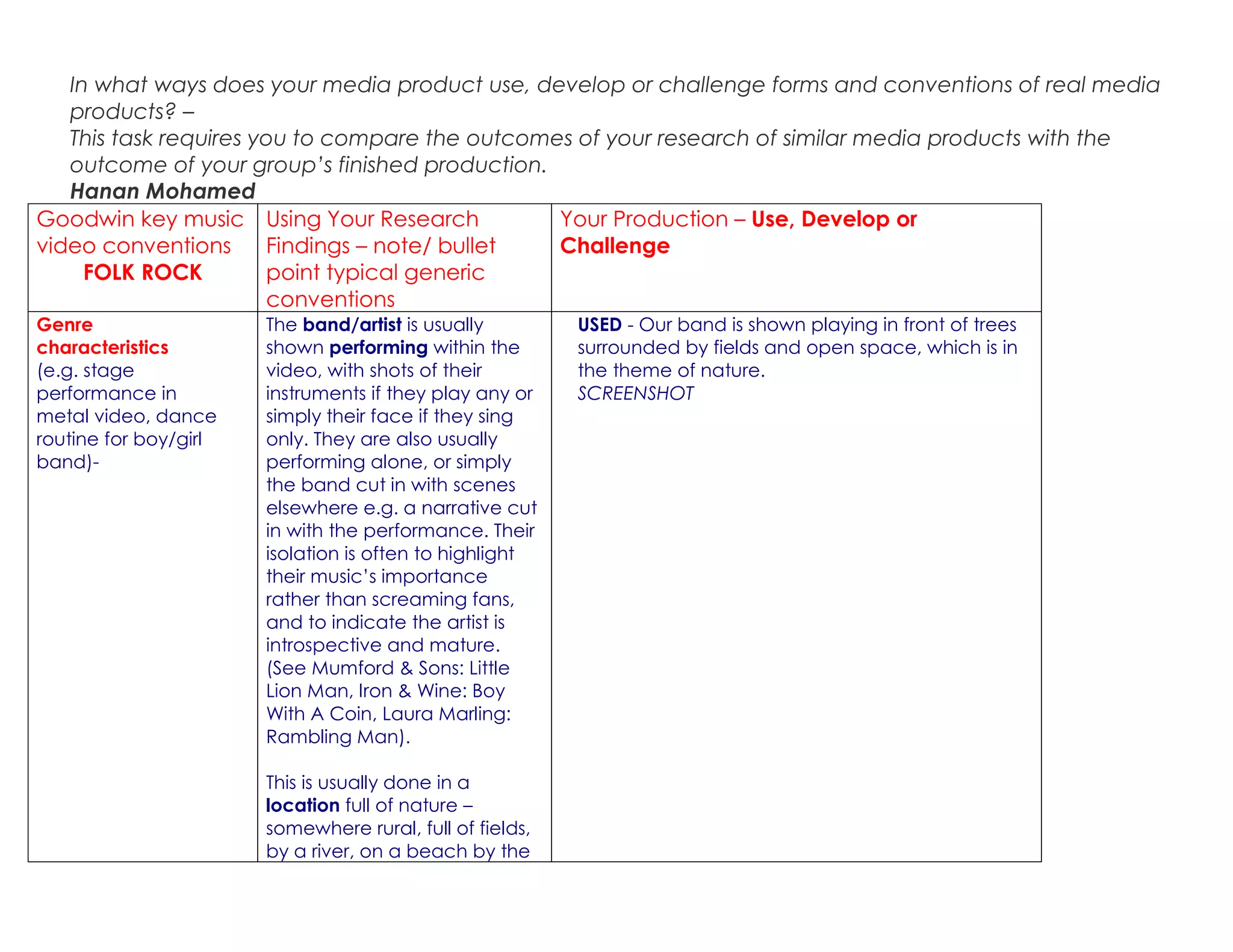 This document compares the conventions of folk rock music videos to the student's own music video production. It finds that the student's video used many typical conventions, such as showing the band performing in a natural rural setting surrounded by trees and fields. It also finds that the student's video developed some conventions by having the music and visuals amplify each other rather than just illustrating the lyrics, such as when the music sped up as the man leapt into the sea. The document analyzes several examples of professional folk rock music videos and identifies their conventions around performance style, nature settings, relationships between music, lyrics and visuals, close-ups of artists, and notions of voyeurism.