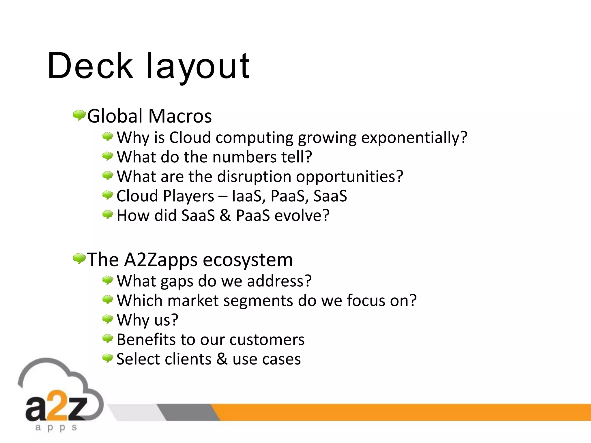 This document provides information about a cloud OS company called A2Zapps. It discusses the growth of cloud computing and opportunities in the market. It then describes A2Zapps' ecosystem which includes interconnected SaaS apps, a social network as a service, and a platform as a service with an app builder. A2Zapps focuses on small and medium businesses by providing rapid app development capabilities and an affordable price point.