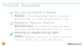 The document outlines an assignment for Buzzfeed writers to create a post about tourism attractions in their university city, emphasizing research on popular articles and social media trends. Writers are given tips on starting their writing and selecting attractions that appeal to the Buzzfeed audience while including multimedia elements. The final deliverables include a Buzzfeed post with links to relevant content and a reflective paper analyzing the elements of a successful post.
