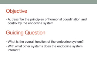 The endocrine system regulates growth, metabolism, water balance, reproduction and stress response through glands that release hormones into the bloodstream. The major glands include the pituitary, thyroid, parathyroids, adrenals, pancreas, ovaries and testes. Hormones deliver messages to target cells through receptors and work in coordination with other body systems like interacting with the nervous system.