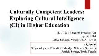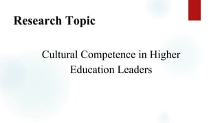 This document discusses the need for cultural competence among administrative leaders in higher education, particularly as institutions begin internationalization efforts. It explores leaders' perceptions of cultural intelligence, which is crucial for fostering an inclusive environment and enhancing global engagement. The study aims to bridge existing research gaps by providing insights that will inform professional development policies for higher education leaders.