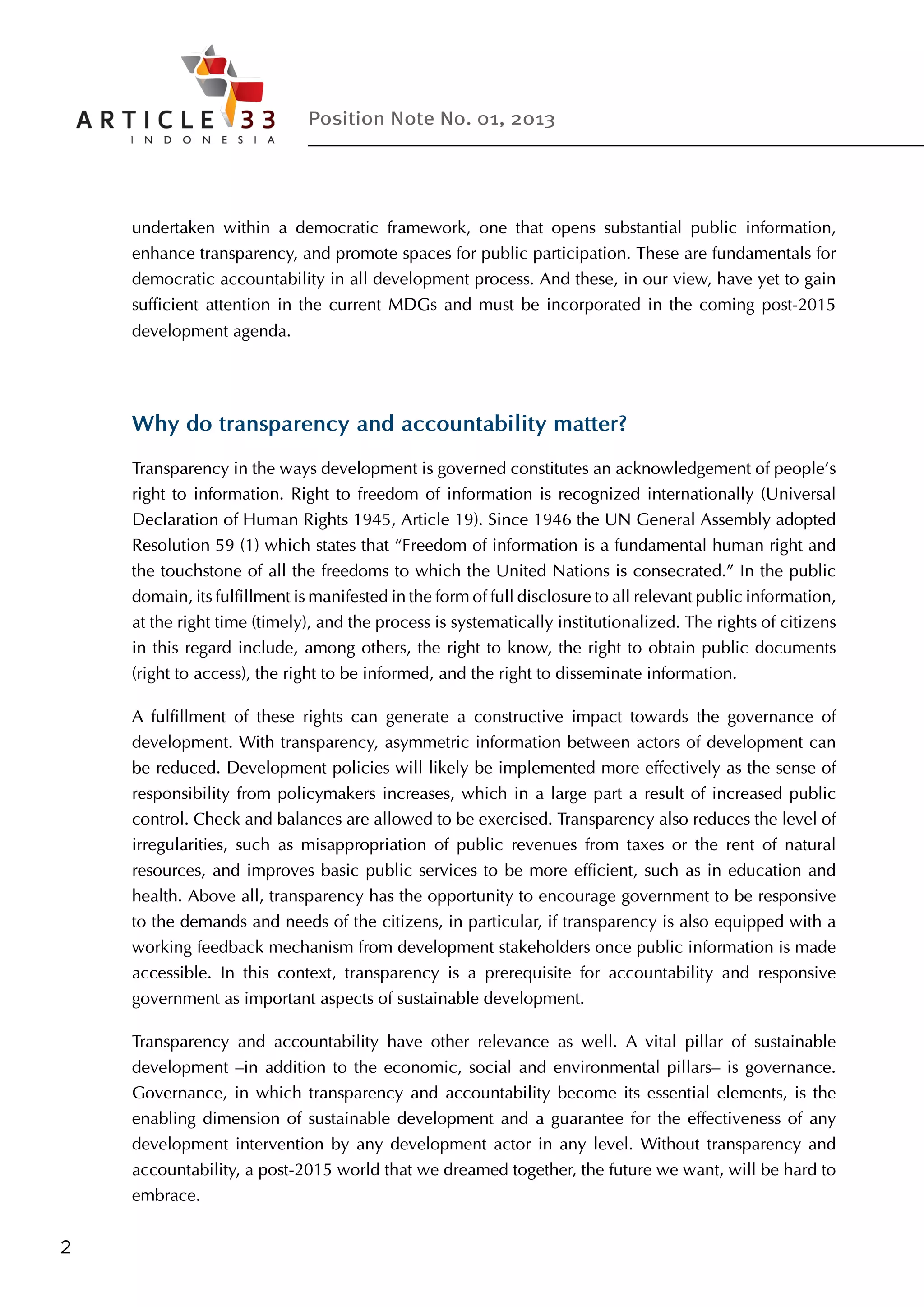As the Millennium Development Goals (MDGs) approach expiration in 2015, a high-level panel is developing a post-2015 global development agenda, emphasizing the need for transparency and accountability in development processes. This document advocates for incorporating these principles to enhance public participation, improve governance, and ensure that development outcomes are responsive to citizens' needs. The recommendations include establishing transparency and accountability as standalone goals or as key targets within each development goal, with necessary capacity building and financing mechanisms to support implementation.