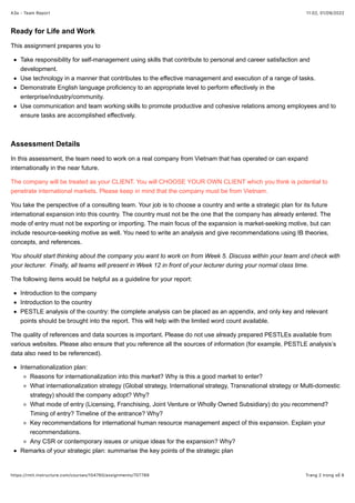 This document provides instructions and assessment details for Assignment 3A, a team report for the course BUSM-3311 - 4626 Global Business. The assignment requires student groups of 4-6 members to choose a Vietnamese company and write a 3000-word strategic plan for the company's international expansion into a new country market. The report must include an introduction to the company and country, a PESTLE analysis of the country, and recommendations on internationalization strategy, entry mode, timing, human resource management, and CSR/contemporary issues. The assignment will be graded based on organization, understanding of course content, argument/critique, writing quality, and referencing/citation format. Late submissions will be penalized 10% per
