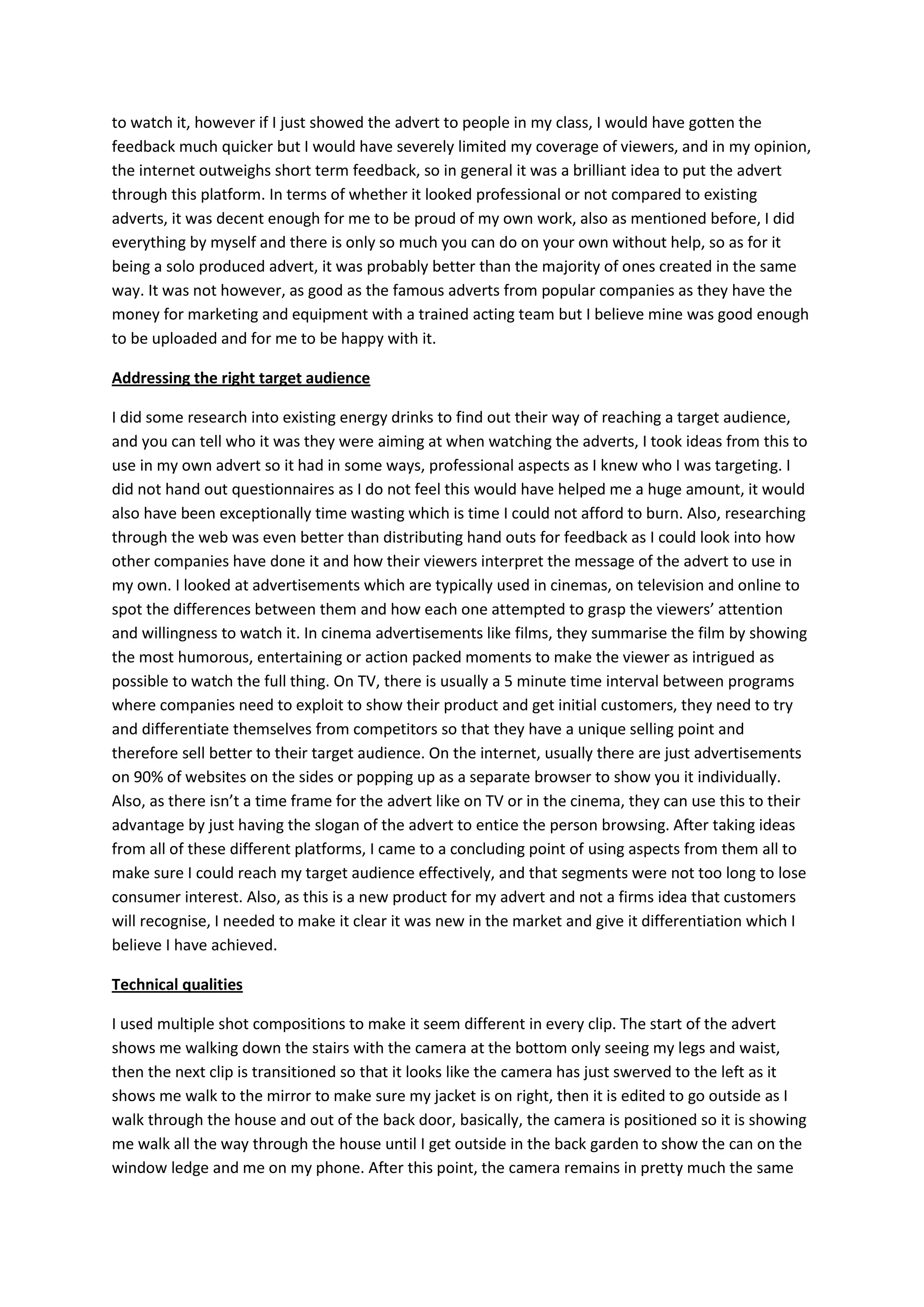 The student created a 1-minute advertisement for an energy drink called "No Remorse" as an assignment. They filmed footage themselves using a provided HD camera and tripod. They edited the clips together in Adobe Premier and added a song to tell a story. The student uploaded the ad to YouTube for feedback. They reflected that working alone made the process easier but limited feedback. Their teacher provided feedback which helped them improve. Overall they felt the ad met the assignment requirements.
