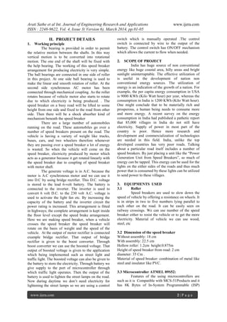 This document describes a study on generating electricity from speed breakers on roads. It discusses how the mechanical energy from vehicles passing over speed breakers can be converted to electrical energy. A prototype was created that connects a roller on the speed breaker to an AC motor via ball bearings and a coupling. As vehicles cause the roller to rotate, it turns the motor which acts as a generator to produce electricity. This electricity can be rectified and stored in a battery then used to power things like streetlights. The document provides details on the components used, calculations for estimated voltage output based on vehicle mass and speed, and diagrams of the system. It is concluded that this technique could help address power issues in a sustainable way.