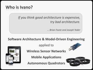 The document discusses the A4WSN framework designed for modeling and managing software architecture in wireless sensor networks (WSNs). It outlines various components such as modeling languages, node configurations, and a programming framework that facilitate the separation of concerns and abstraction in WSN software development. Additionally, it highlights future work opportunities and calls for contributions to enhance the framework's capabilities.