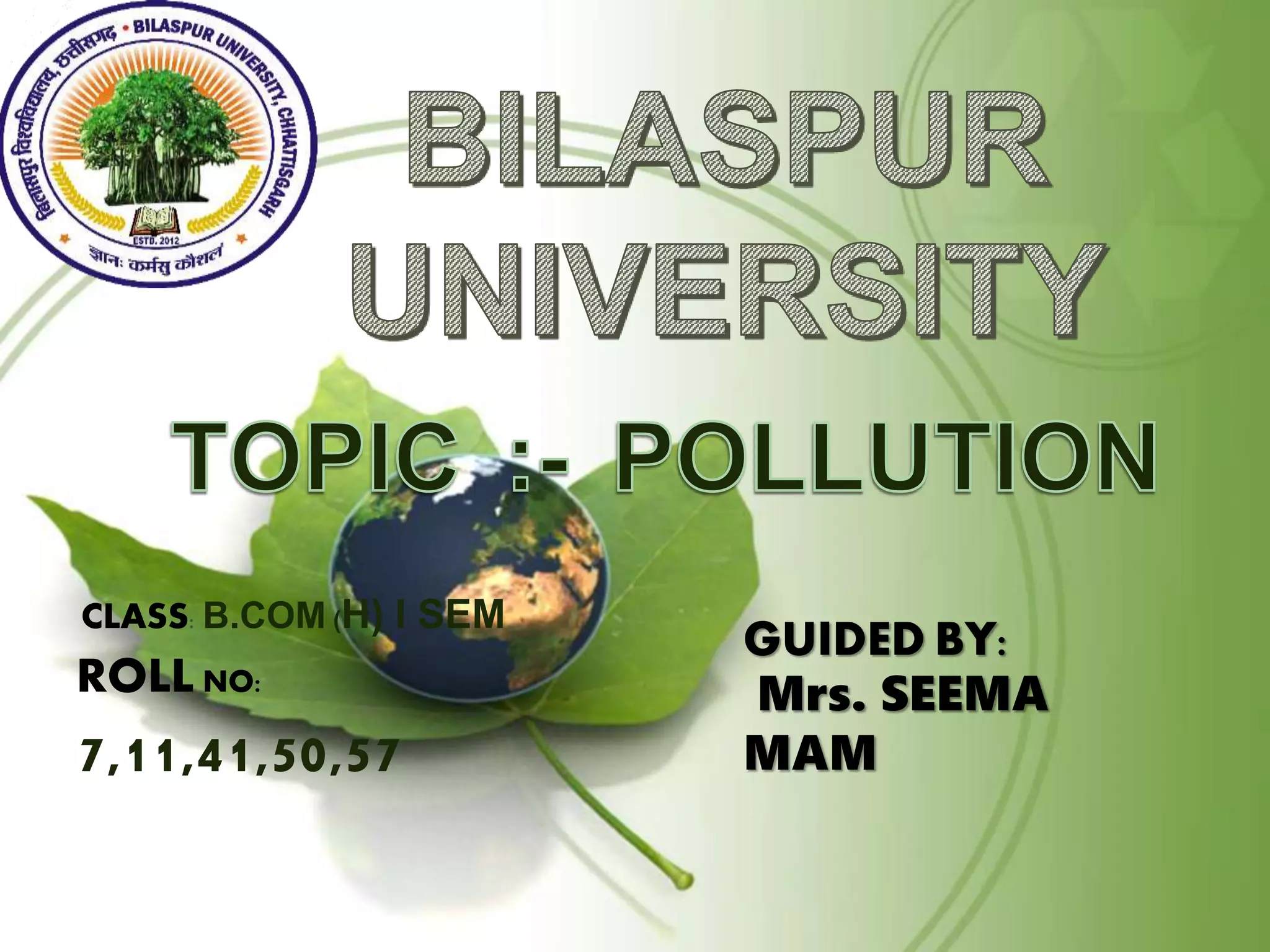 This document discusses different types of pollution including air, water, noise, light, and soil pollution. It defines each type of pollution and provides examples of sources and effects. For each type of pollution, it also discusses ways to control and prevent further pollution, such as maintaining a healthy distance between industrial and residential areas for air pollution, conserving water and properly disposing of waste to prevent water pollution, limiting noise from vehicles and machinery to reduce noise pollution, and treating industrial and agricultural waste to control soil pollution. The document aims to raise awareness about the different types of pollution and measures that can be taken to address pollution issues.