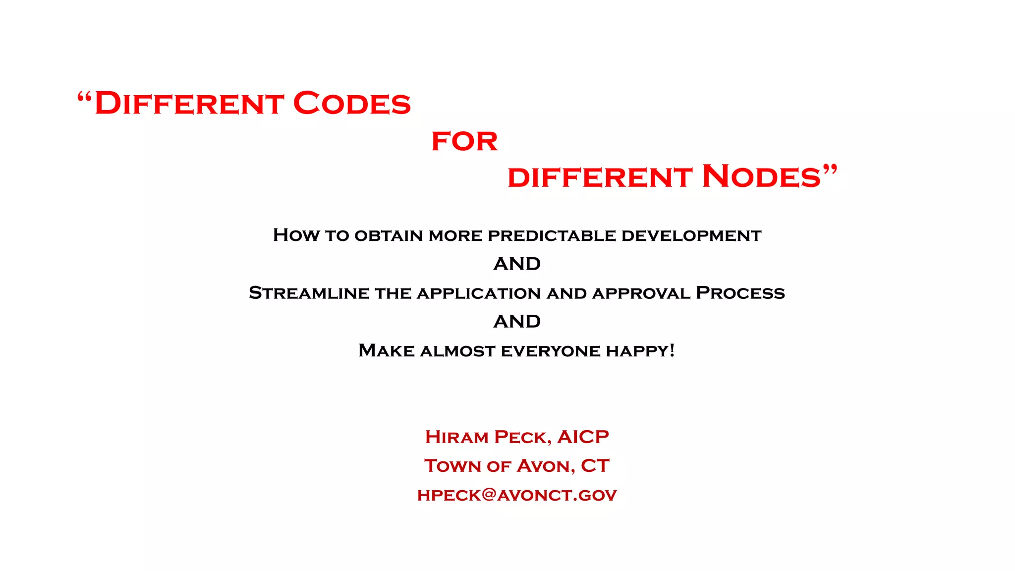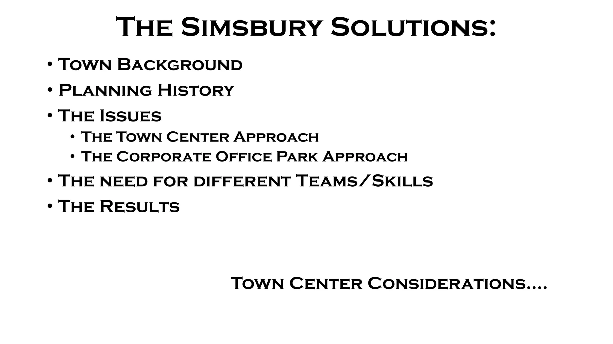 The document discusses the development of different form-based codes for two distinct areas in Simsbury, CT - the historic town center and a large corporate office park property. For the town center, a charrette was held to develop an illustrative plan and form-based code to guide higher density, high-quality development while preserving the historic character. For the corporate office park, a different approach was needed due to the setting and the property being an economic driver; this resulted in a code focused on place-driven job creation through a public-private partnership. Both codes required unique skillsets and processes to develop but achieved successful outcomes like increased development certainty and community acceptance.