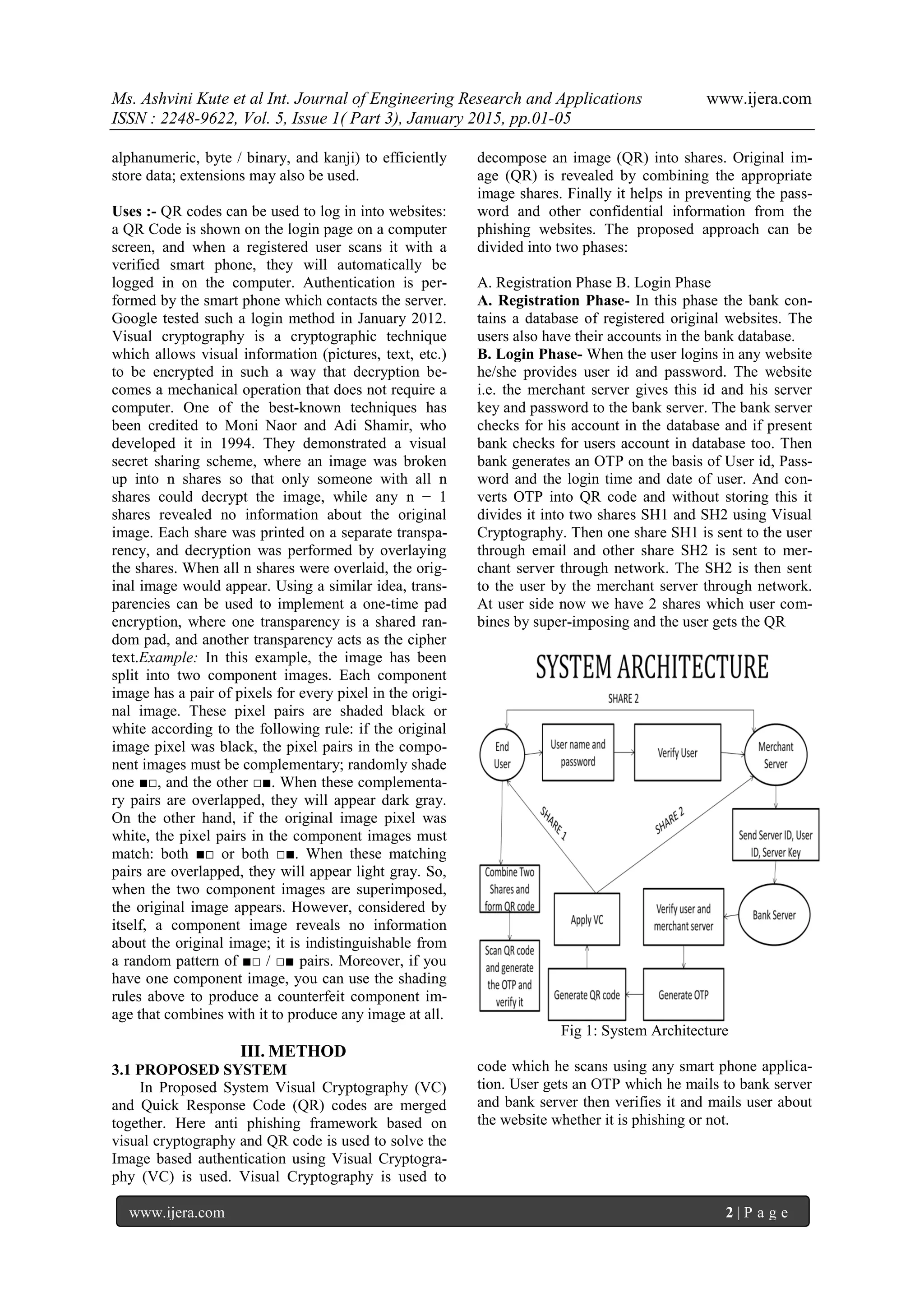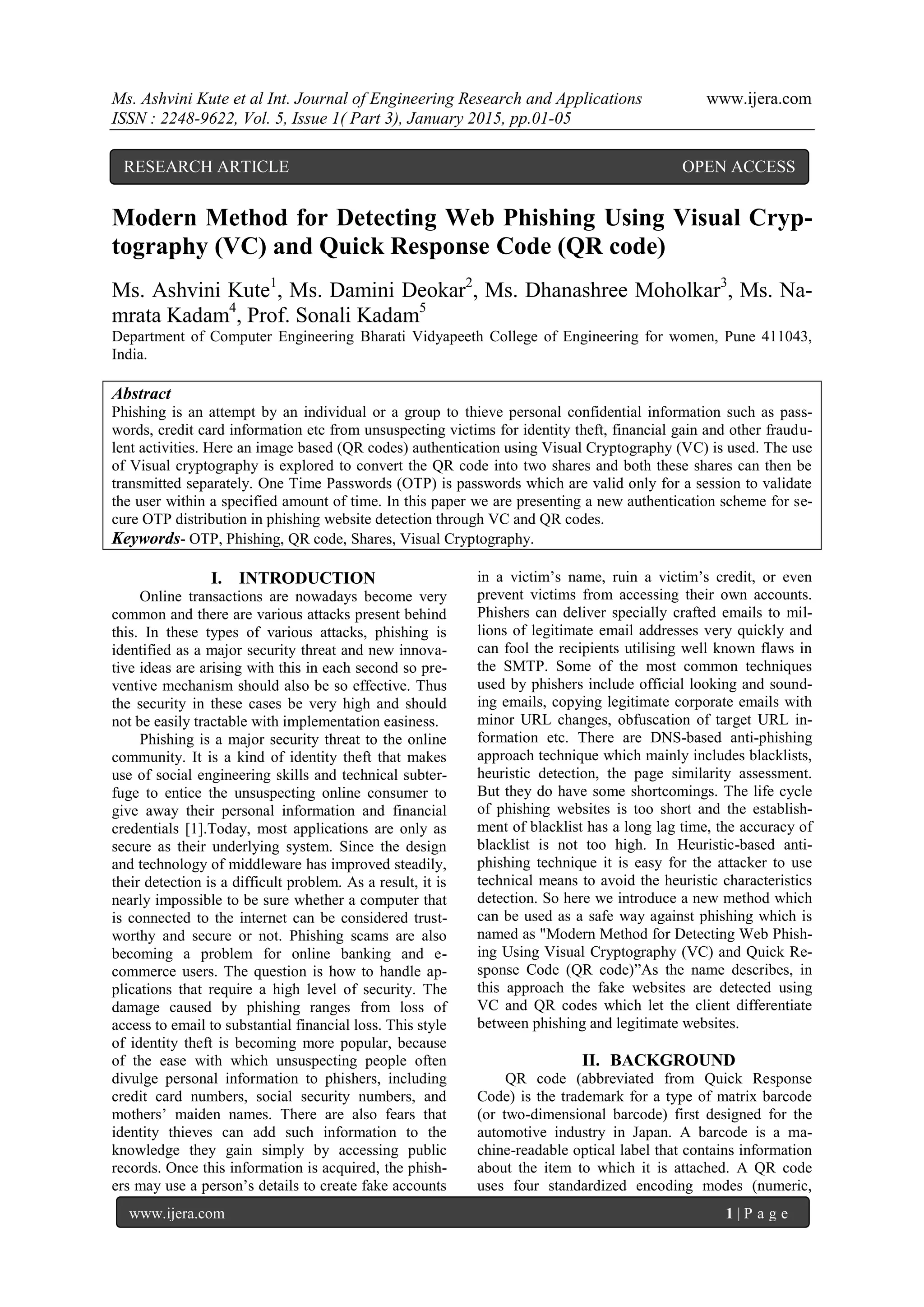 This document presents a new method for detecting web phishing using visual cryptography (VC) and quick response (QR) codes to enhance security in online transactions. By splitting the QR code containing a one-time password (OTP) into two shares and sending them separately, the approach aids in differentiating between phishing and legitimate websites. The proposed system aims to address the major security threat of phishing by improving the authentication process and protecting users' confidential information.