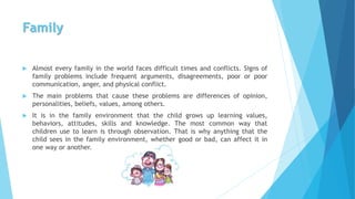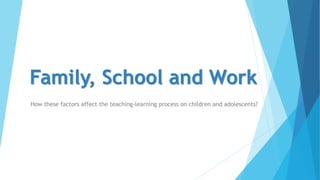 This document discusses how family, school, and work can affect the learning process of children and adolescents. It notes that family problems like arguments and poor communication can negatively impact a child's emotions, concentration, and relationships. While parental involvement benefits learning, unsupportive families may cause children to feel unappreciated. Work can endanger children physically and mentally by preventing school attendance and exposing them to illness, abuse, stress, and a loss of hope. Overall, the document examines the importance of a positive family environment and access to education for healthy child development.