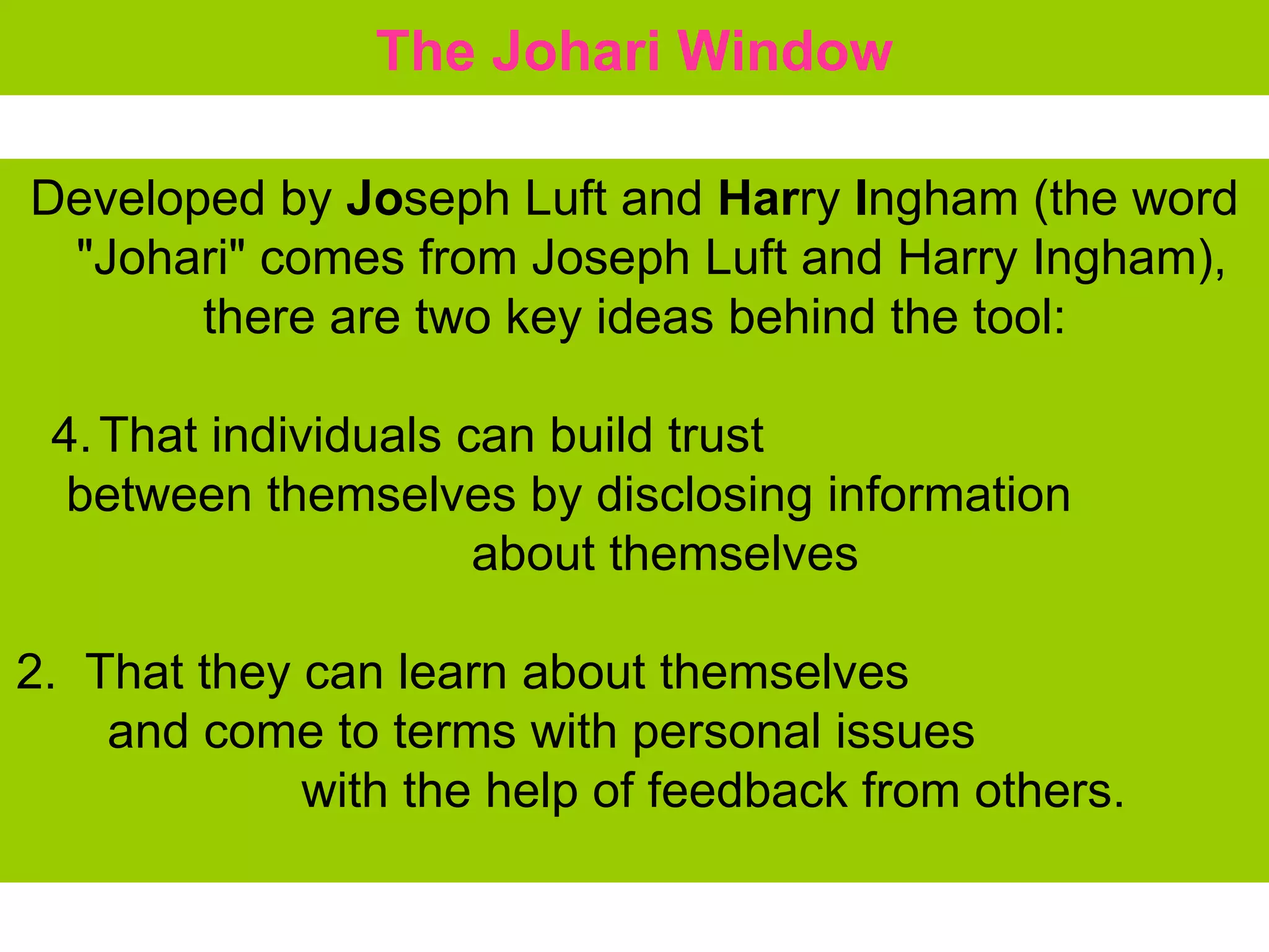 The Johari Window is a tool for self-awareness and building trust between individuals. It involves four "windows" that represent different levels of openness between a person and others: the open arena (known to self and others), blind spot (known to others but not self), facade (known to self but not others), and unknown (unknown to both self and others). Providing feedback and disclosure to others can help expand awareness and the open arena while reducing the blind spot and facade.
