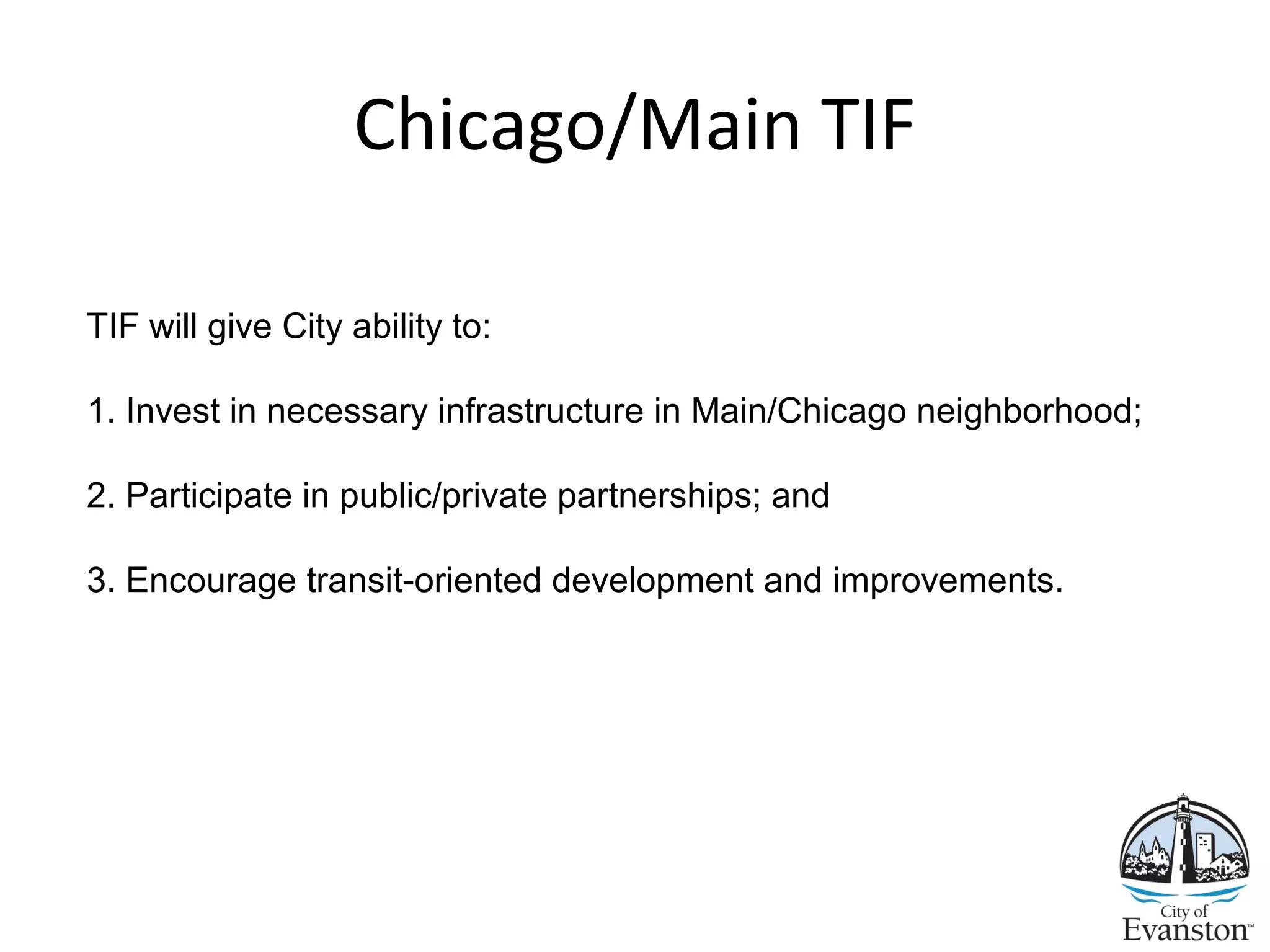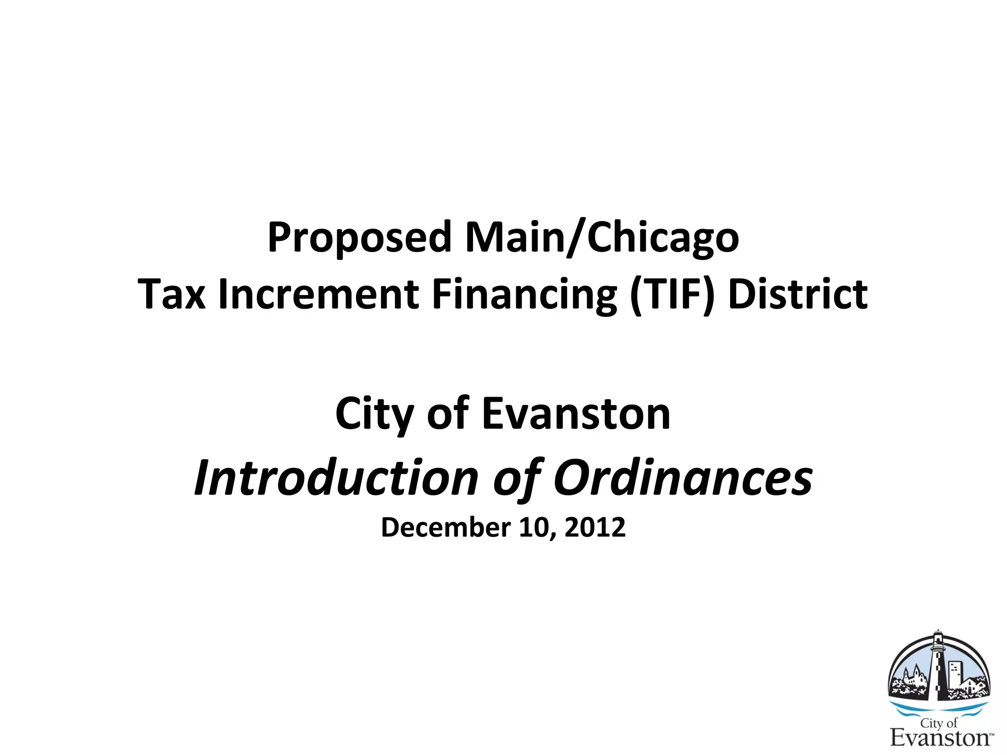 The document proposes establishing a Tax Increment Financing (TIF) district along Main/Chicago in Evanston to fund infrastructure improvements and encourage development. It outlines three ordinances for approval and describes the key elements of the TIF plan, including establishing a $25 million budget over 23 years. Funds would support land acquisition, utilities, rehabilitation, facilities, and other eligible redevelopment costs. The document finds the area eligible for TIF based on lack of growth in property values compared to the city and issues like deterioration. An implementation plan has been developed through meetings with aldermen and merchants to prioritize projects focused on parking, streetscapes, property upgrades, and creating open space to spur transit-oriented development.
