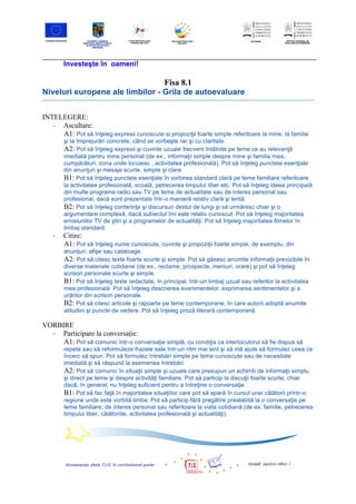 Documentul detaliază utilizarea tehnologiilor informaționale și de comunicație (TIC) în predarea limbilor moderne, oferind exemple de activități adaptate pentru fiecare ciclu de învățare de la clasa a II-a până la a XII-a. Se propune un plan de lecție structurat în grupuri pentru a încuraja colaborarea și creativitatea în utilizarea TIC. De asemenea, sunt incluse grile de autoevaluare bazate pe nivelurile europene de competență lingvistică.